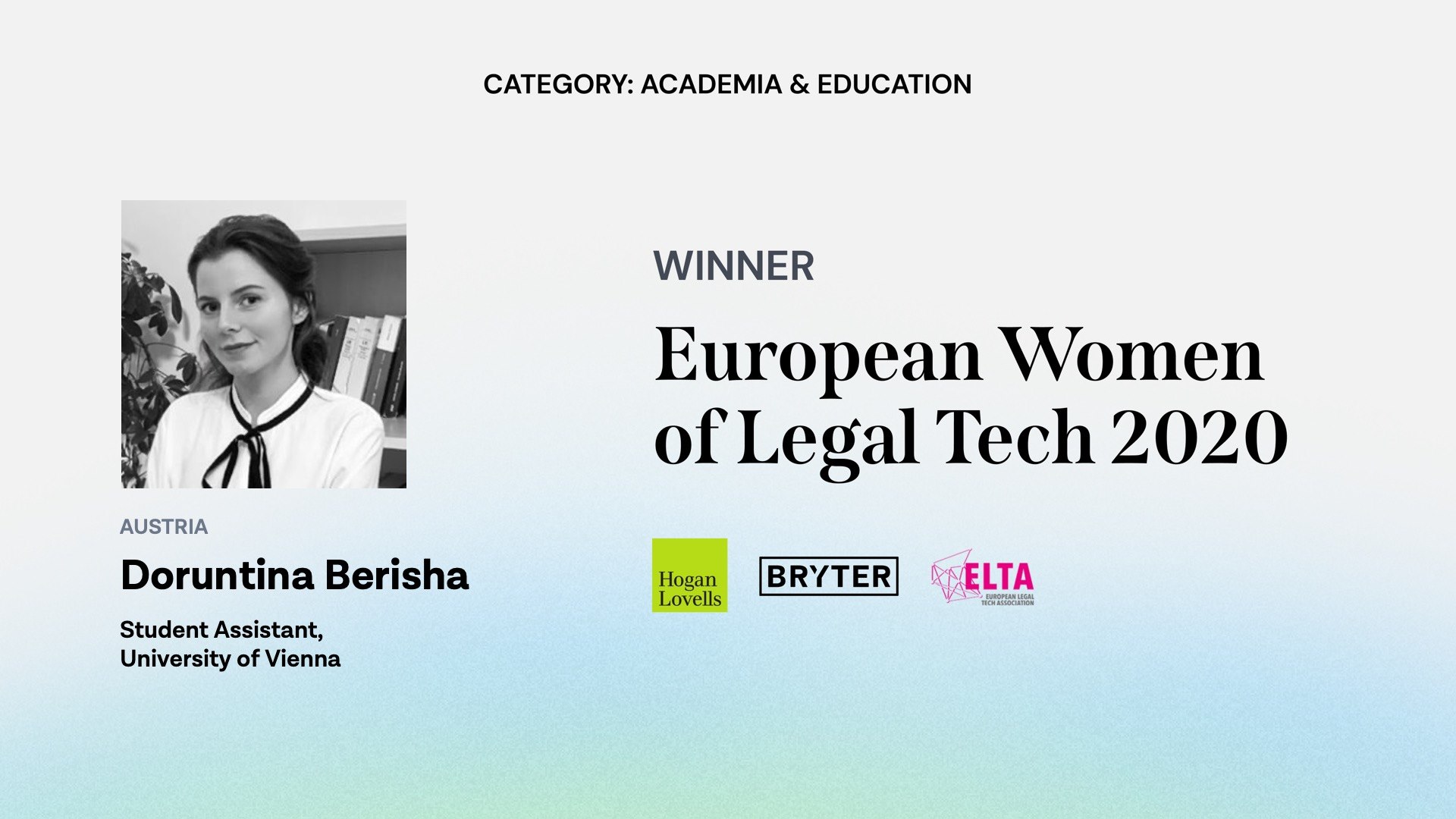 Studentja dhe asistentja shqiptare e Fakultetit Juridik në Vjenë, Doruntina Berisha, ka fituar në garën “Eurpoean Women of Legal Tech 2020 Award”. Në këtë garë kanë marrë pjesë 179 femra, nga 27 vende të ndryshme të Evropës dhe ishin të ndara në pesë kategori. Doruntina fiton në kategorinë “Akademi & Edukim”.