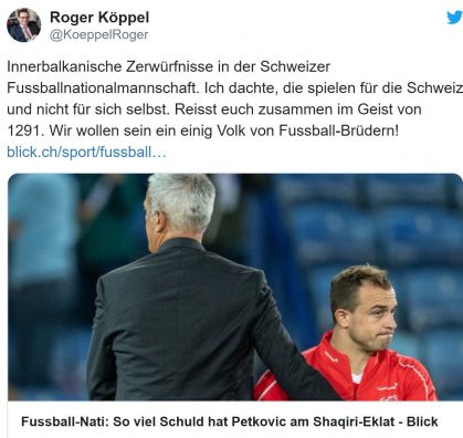 Duke shpërndarë në twitter një artikull të gazetës Blick, Köppel ka shkruar: “Mosmarrëveshjet ballkanike në Ekipin Kombëtar të Futbollit të Zvicrës. Unë mendoja se ata luajnë për Zvicrën dhe jo për veten e tyre. Bëhuni bashkë, në frymën e vitit 1291 (viti i “besëlidhjes” që krijoi Zvicrën, v.j.). Ne duam të jemi një popull unik prej vëllezërish të futbollit!”, ka shkruar Köppel, duke hedhur shigjetat e tij drejt Nati-t dhe besimit që sipas tij, e ka humbur prej kohësh kjo kombëtare te zviceranët “e vërtetë”.
