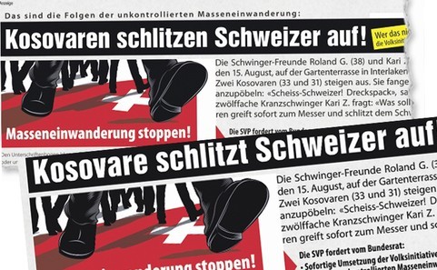 Siç ka shkruar tashmë edhe albinfo.ch, SVP-UDC në një afishe të shpërndarë nëpër vende të dukshme në qytetet zvicerane në fund të muajit gusht të vitit 2011 kishte shkruar mesazhin “Kosovarët therin zviceranët”. Këtë afishe e kishin vendosur në kuadrin e fushatës për iniciativën për ndalimin e “migracionit masiv”. Pak pas publikimit të afishes, dy kosovarë kishin ngritur padi penale kundër personave përgjegjës dhe kundër vetë SVP-së.