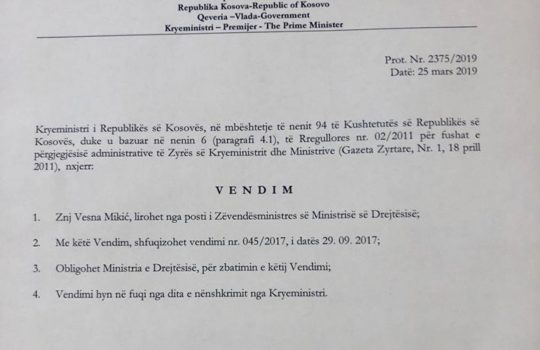 - Qeveria serbe deklarohet pas shkarkimit të zv.ministres së Drejtësisë