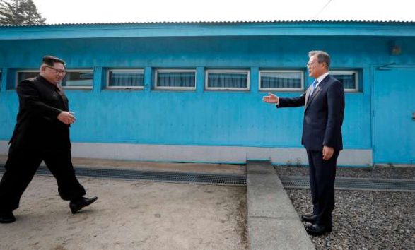 Në një moment plot simbolikë, lideri koreanojugor Moon Jae dhe Kim shtrënguan duart në kufi, në të dyja anët e tij për të qenë të saktë, pasi Kim e ftoi Presidentin e Koresë së Jugut që për pak çaste të kalonte kufirin drejt Veriut. Ndryshimi i situatës është kolosal, pasi vetëm pak muaj më parë diskutimi mes vendeve ishte luftarak, ndërsa tani ata mund të diskutojnë paqen dhe armët bërthamore. Sipas mediave kineze, kjo kthesë e lidershipit koreanoverior ka ndodhur si pasojë e një dëmtimi masiv të malit ku kryheshin testet bërthamore të saj dhe ku gjatë shtatorit 2017 vdiqën rreth 200 persona.