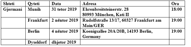 Aktiviteti, përkatësisht takimi, për fuqizimin e rrjeteve të juristëve, dhe nxitjen e themelimit të Shoqatës së Juristëve/Avokatëve “Shqiptaro-Gjermane” në Gjermani do të realizohen në këto qytete me itinerarin si vijojnë: