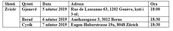 Aktiviteti, përkatësisht takimi, për fuqizimin e rrjeteve të juristëve, dhe nxitjen e themelimit të Shoqatës së Juristëve “Shqiptaro-Zvicerane” do të realizohen në këtë itinerar: