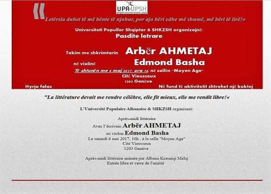 Universiteti Popullor Shqiptar i Gjenevës në bashkëpunim me SHKSHZ organizon të shtunën, më 6 maj një takim letrar me shkrimtarin Arbër Ahmetaj i cili jeton dhe krijon në Zvicër.