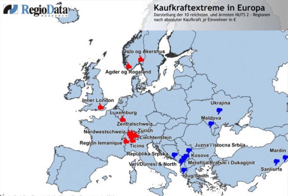 Mesatarja e të ardhurave vjetore neto që është njëherësh emërtim për fuqinë blerëse për person në Evropë është 14.739 euro. Por dallimet në mes të kreut dhe fundit në këtë listë janë tepër të mëdha. Kështu, më të pasurit, në vendin e parë dhe me diferencë të madhe nga i dyti, janë qytetarët e Principatës së Lihtenshtajnit, shkruan aktiencheck.de.