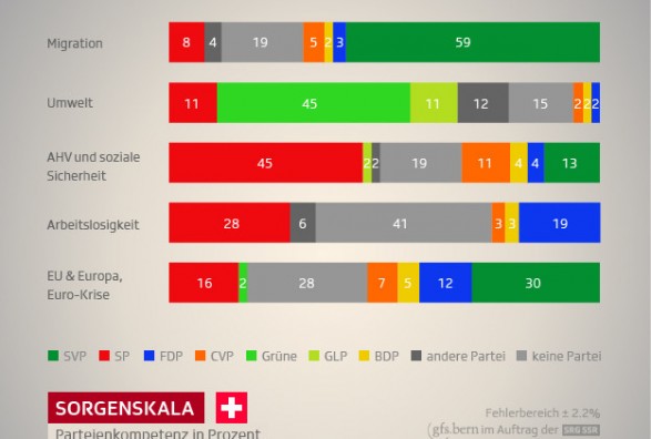 Por për 19% të personave të anketuar që janë paraqitur si të pa parti ose që u takojnë “partive tjera”, migracioni është preokupimi numër një, dhe kjo e ngre sigurisht atë në vendin e parë të temave brengosëse. Ndërsa zgjedhësit e partive tjera si FDP/PLR, CVP/PDC dhe BDP migracionin e konsiderojnë vetëm 6, respektivisht 2 dhe 3% si shqetësimin kryesor të tyre.