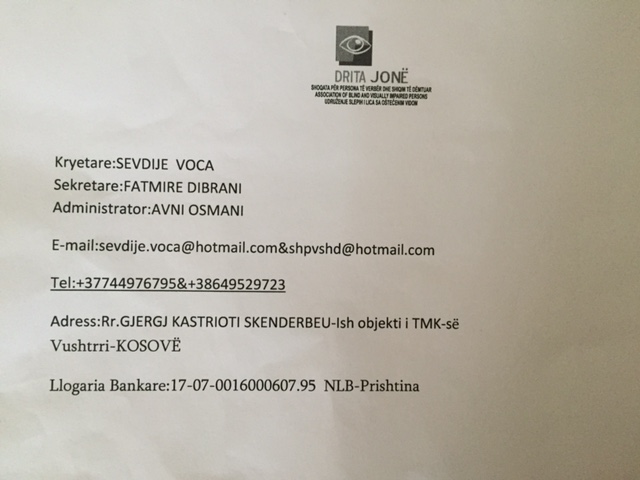 Kryetarja e shoqatës “Drita Jonë”, Sevdije Voca, edhe vet e verbër, e kontaktuar nga albinfo.ch tejet e emocionuar rrëfeu për humanizmin që po tregojnë mërgimtarët me rastin e festës së Fitër Bajramit ndaj komunitetit të të verbërve në Kosovë, kategori e cila është lënë në harresë nga shoqëria kosovare. Ajo na njoftoi se kjo shoqatë është themeluar në tetor te vitit 2014 dhe tanimë numëron mbi njëqind anëtarë të të gjitha komuniteteve, nga Vushtrria dhe nga Mitrovica. Shoqata është e themeluar me qëllim të mbrojtjes së të drejtave të personave të verbër dhe atyre me shikim të dobësuar. Ajo angazhohet në integrimin e kësaj shtrese të shoqërisë. Lokalet e kësaj shoqate janë në ndërtesën e ish TMK/së dhe ato i janë dhënë në dispozicion shoqatës nga komuna pa pagesë, njofton kryetarja Voca. Anëtarët e regjistruar në këtë shoqatë paguajnë anëtarësi për një vit nga 6 euro dhe kësisoj ata mund te përfitojnë nga benificione të shumta të cilat u garantohen me ligj personave e verbër siç janë: nxjerrja e pasaportës dhe lejenjoftimit pa pagesë, transportin pa pagesë dhe lehtësime tjera për të cilat shumica e të dëmtuarve fatkeqësisht nuk janë të informuar dhe nuk i shfrytëzojnë ato, theksoi ajo për portalin albinfo.ch