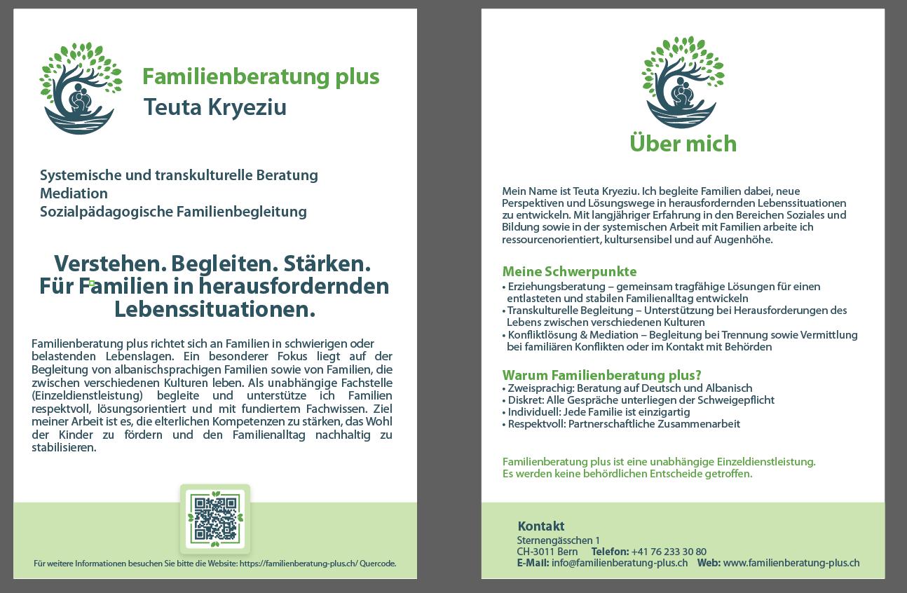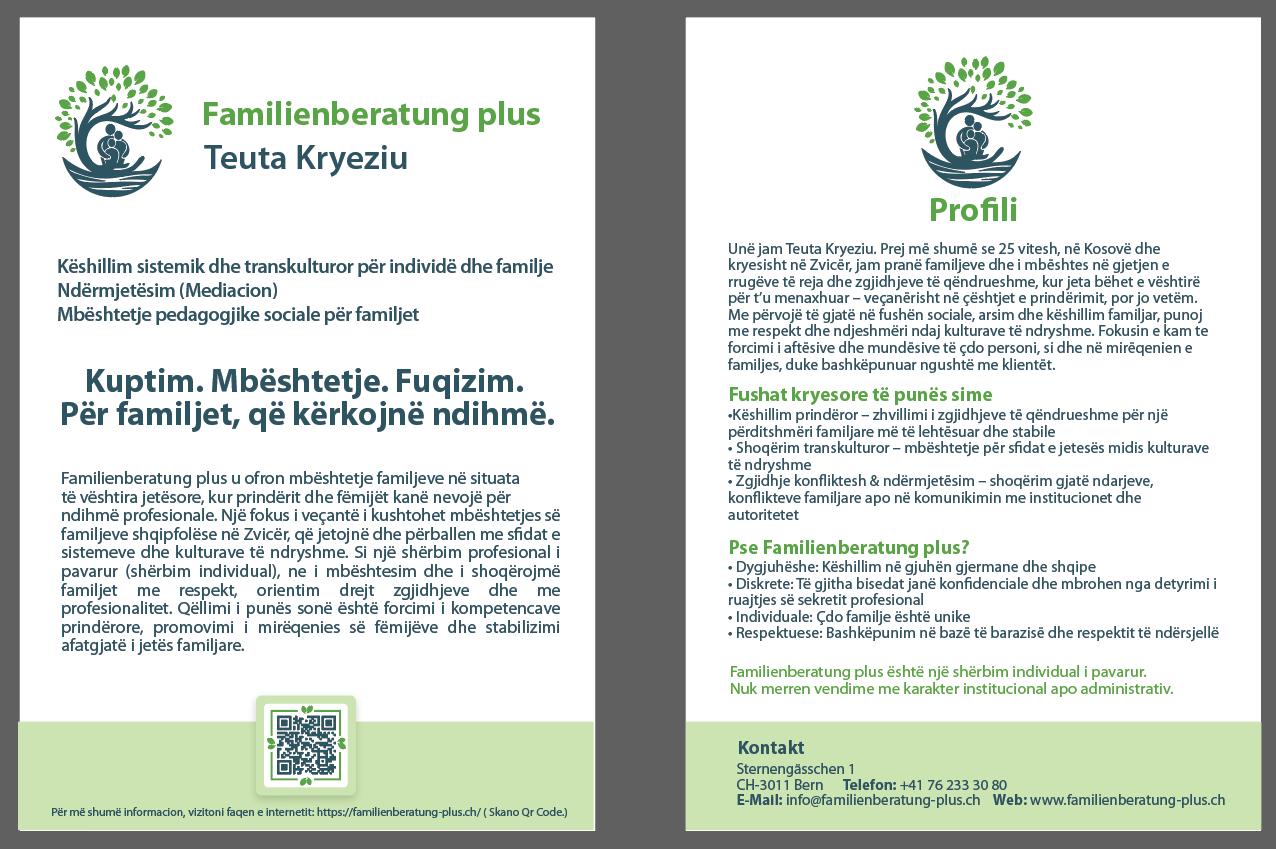 Për ata që kërkojnë mbështetje profesionale, Teuta Kryeziu mund të kontaktohet përmes Familienberatung plus në Bernë, në adresën: Sternengässchen 1, përmes telefonit +41 76 233 30 80 ose në e-mailin [email protected]. Informacione të mëtejshme janë të disponueshme në: https://familienberatung-plus.ch/