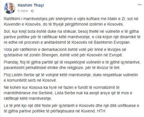 “Sot, kur krejt bota është duke na shikuar, besoj thellë në vullnetin e të gjitha partive politike për të ratifikuar këtë marrëveshje, e cila krijon një dinamikë të re edhe në procesin e anëtarësimit të Kosovës në Bashkimin Evropian. Vota për ratifikimin e demarkacionit është votë për lirinë e lëvizjes së qytetarëve në zonën Shengen, është votë për Kosovën në Evropë”, ka shkruar Thaçi në rrjetin social Facebook.