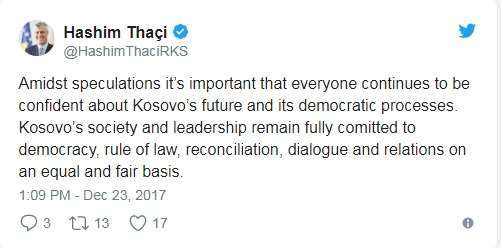 Thaçi, pa i përmendur emrat e atyre që i kanë bërë këto paralajmërime, i ka quajtur ato spekulime. Ai ka thënë se midis spekulimeve është e rëndësishme që të gjithë të vazhdojnë të jenë të sigurt për të ardhmen e Kosovës dhe proceset e saj demokratike.