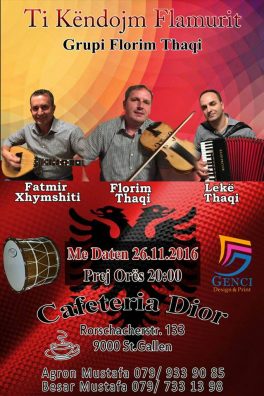 Më 26.11.2016 prej orës 20.00, Cafeteria Dior në St. Gallen organizon muzikë popullore me grupin e Florim Thaqit.