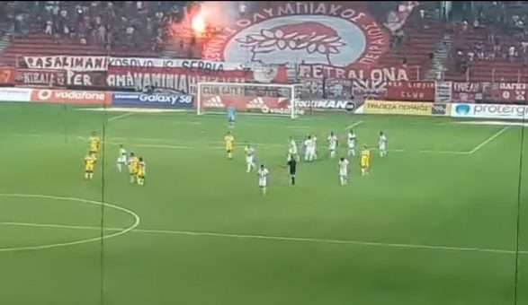 Tifozët e Olympiacosit kishin shpalosur një pankartë të madhe “Kosova është Serbi”, që ka qëndruar gjatë gjithë ndeshjes dhe nuk është larguar.
