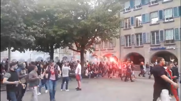 Në lagjen Lorrene, tifozët serbë hodhën disa kanaçe të plota birre në një terracë të kafiterisë Café Kairo për shkak të një flamuri “LGBT”, raportoi një reporter nga agjencia e lajmeve Keystone-SDA. Nuk ka asnjë informatë për personat e lënduar, përcjell albinfo.ch