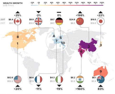 Gjatë dekadës së fundit, Kina dhe India kanë dyfishuar pasurinë e tyre. Ndërkohë, ekonomitë e zhvilluara si Shtetet e Bashkuara dhe Japonia kanë rritur pasurinë me ritme modeste. Italia dhe Franca kanë humbur edhe shuma modeste të pasurisë private gjatë asaj kohe.