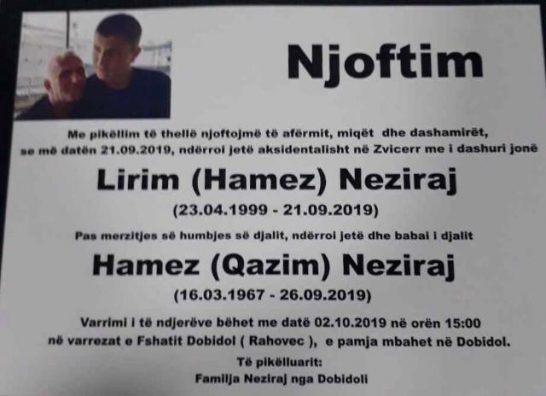 Dy raste të rënda kanë goditur ditë më parë familjen Neziraj nga Dobidoli i Rahovecit të Kosovës, azilkërkues në Zvicër. Së pari, siç merr vesh albinfo.ch nga burimet e afërta me familjen, më 21 shtator djali 20 vjeçar Lirim (Hamëz) Neziraj, i sëmurë nga epilepsia dhe autizmi, ka humbur jetën nën rrotët e trenit në Oerlikon të Cyrihut.