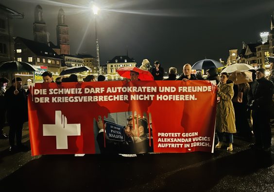Kundër paraqitjes së presidentit serb, Aleksandar Vuçiq, në një pritje të organizuar për të nga revista zvicerane “Die Weltwoche”, janë mbledhur sonte një numër aktivistësh shqiptarë dhe qytetarësh të Zvicrës, në sheshin Rathausbrücke të Cyrihut. Revista në fjalë dhe kryeredaktori i saj, Roger Köppel, janë të njohur për qëndrime të hapura pro Putin dhe pro Vuçiq, që bien në kundërshtim me opinionin mbizotërues në Zvicër, shkruan albinfo.ch.
