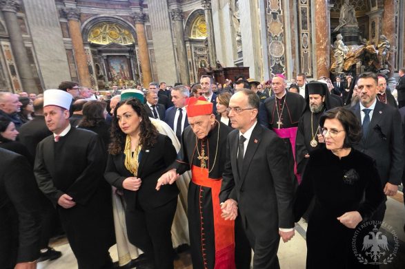 Udhëheqës të komuniteteve fetare nga Shqipëria dhe Kosova i janë bashkuar presidentëve Bajram Begaj e Vjosa Osmani në një delegacion të përbashkët për të bërë homazhe në nderim të Papa Françeskut në Vatikan.