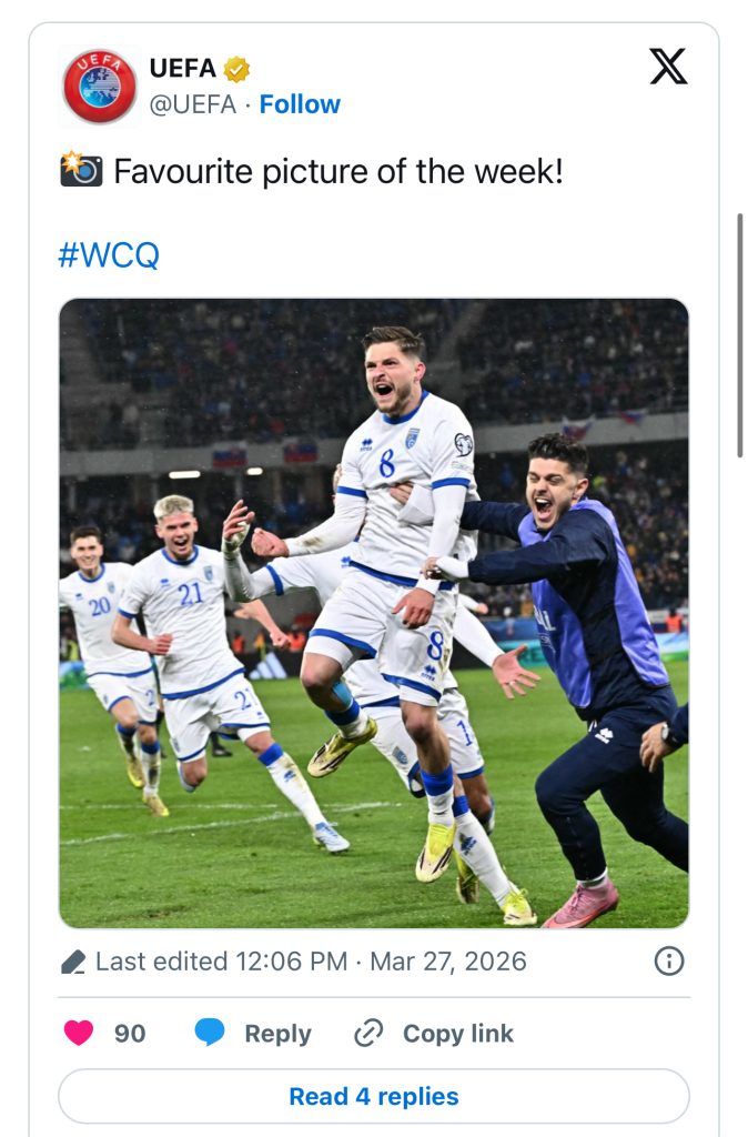 Pas fitores dramatike 4-3 ndaj Sllovakisë, UEFA ka përzgjedhur momentin e golit spektakolar nga goditja e lirë të Florent Muslijës si fotografinë më të bukur të javës, duke e vendosur Kosovën në qendër të vëmendjes së futbollit evropian, përcjell albinfo.ch.