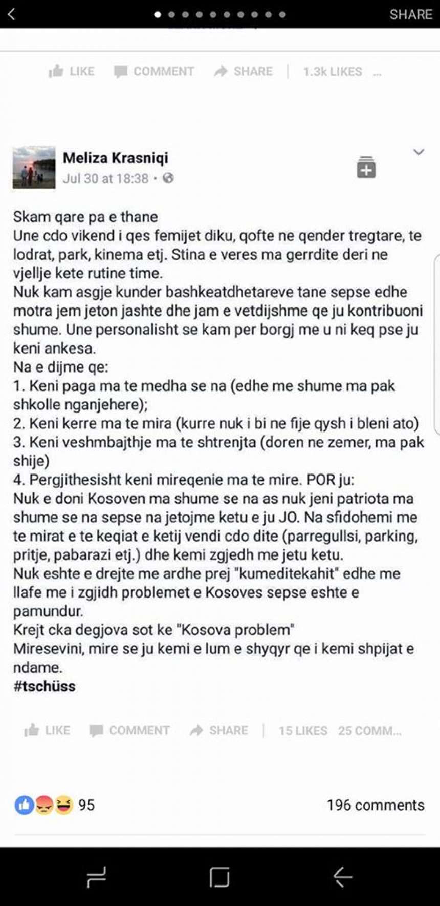 Ndërkohë, e përballur me numrin e madh të reagimeve, Meliza Krasniqi ka bërë edhe një postim, ku kërkon falje për postimin e mëparshëm.