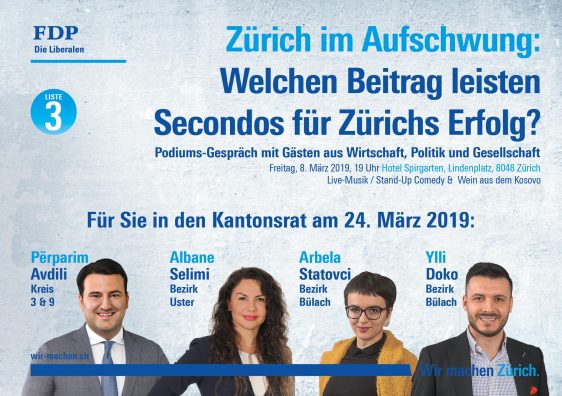 Katër kandidatët shqiptarë të FDP-së për Zgjedhjet Kantonale, ju mirëpresin në aktivitetin e tyre elektoral për këto zgjedhje, që do të organizohet të premten më 8 mars, ora 19, në Hotel Spirgarten, Lindenplatz, 8048 Zürich.