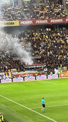 Ndryshe, që nga fillimi i ndeshjes, rumunët dëgjoheshin duke brohoritur “Serbia, Serbia” teksa pas portës së ekipit të Kosovës, u shfaq pano “Kosova është Serbi”.