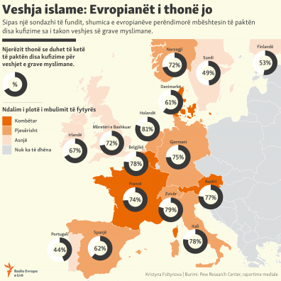 Sipas një sondazhi të fundit, shumica e evropianëve perëndimorë mbështesin të paktën disa kufizime sa i takon veshjes së grave myslimane, raporton “Radio Evropa e Lirë”, në bazë të një grafike të paraqitur.