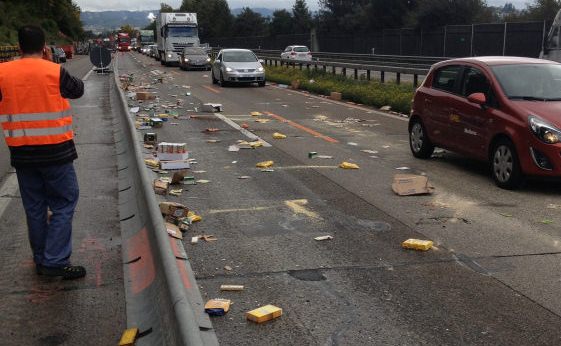 Nga një kamion i ngarkuar me artikuj ushqimorë janë derdhur dje në autostradën A1, afër Rothristit (kantoni Solothurn) mallra ushqimore me shumicë. Kjo ofertë e padëshiruar ushqimesh mbi asfalt u ka nxjerrë telashe organeve të rendit.