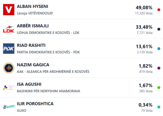 Sipas këtyre të dhënave, Hyseni ka siguruar 49.08 për qind të votave, duke mbajtur një avantazh ndaj kandidatit të Lidhjes Demokratike të Kosovës (LDK), Arbër Ismajli, i cili ka marrë 33.48 për qind, shkruan albinfo.ch.