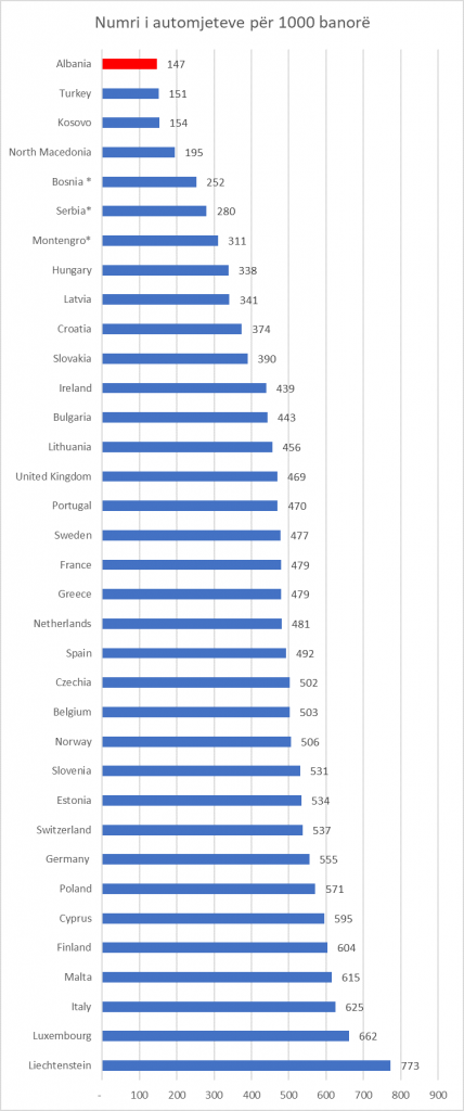 Sipas të dhënave të Eurostat, Shqipëria numëroi 146.7 automjete për 1000 banorë, duke u renditur kështu e fundit në rajon dhe në Evropë për këtë tregues.