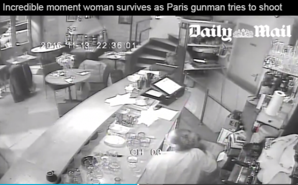 Po ashtu aty shihet qartë se si shpëton një grua nga breshëritë e plumbave të xhihadistit, teksa ai mbante armën mbi kokën e saj.