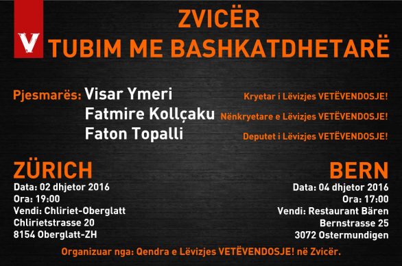 Sonte, 2 dhjetor në Cyrih dhe pasnesër, më 4 dhjetor në Bernë, kryetari i Lëvizjes Vetëvendosje Visar Ymeri me bashkëpunëtorë do të ketë dy takime me bashkatdhetarë.