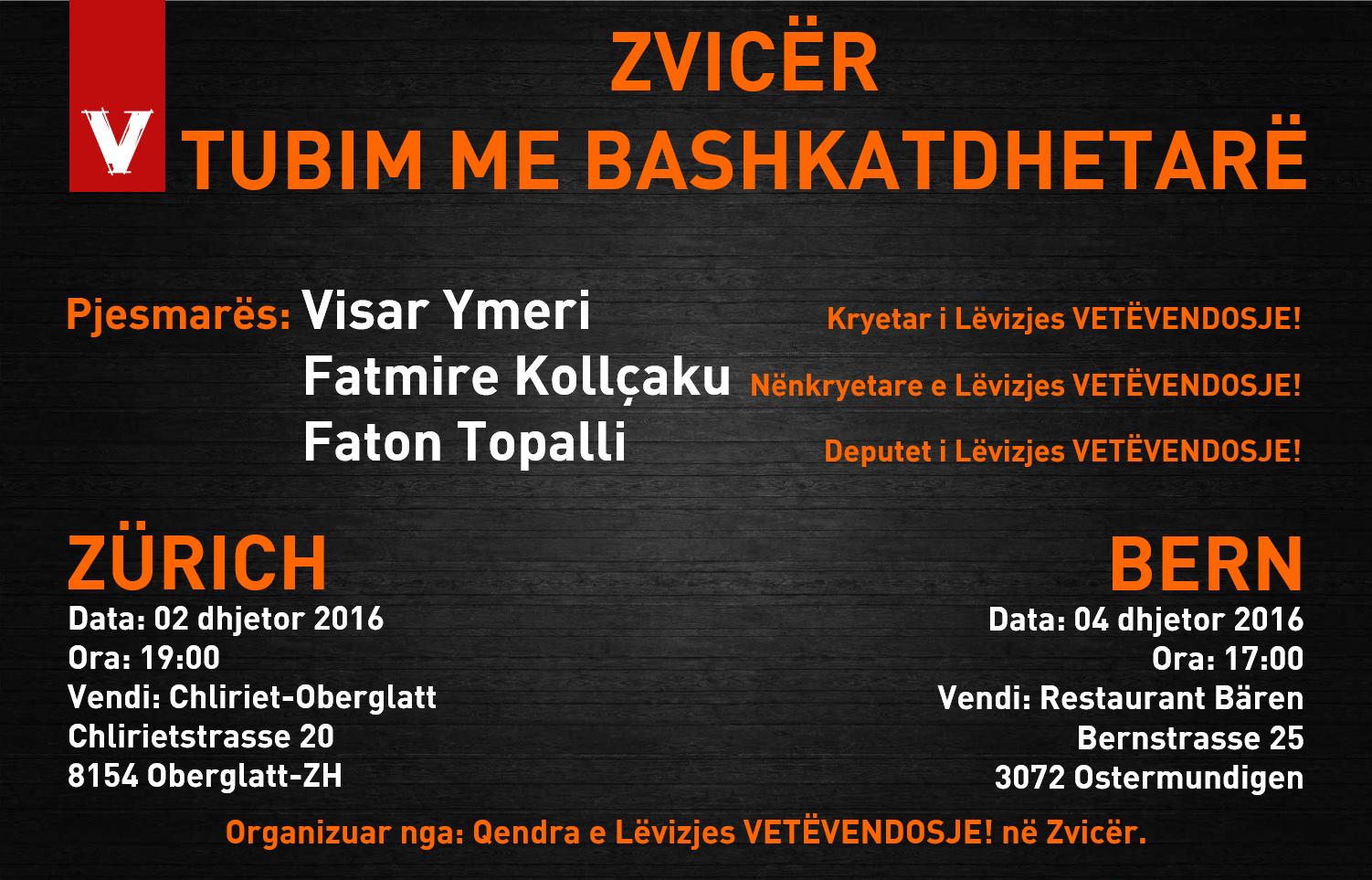 Sonte, 2 dhjetor në Cyrih dhe pasnesër, më 4 dhjetor në Bernë, kryetari i Lëvizjes Vetëvendosje Visar Ymeri me bashkëpunëtorë do të ketë dy takime me bashkatdhetarë.