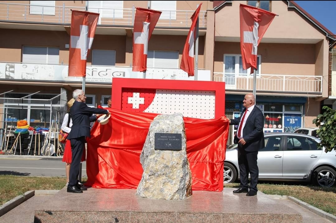 Ndërkaq, në aktivitetin për zbulimin e obeliskut të Micheline Calmy-Rey, ambasadori i Zvicrës në Kosovë, Thomas Kolly tha se ajo fatkeqësisht nuk ka mundur të jetë e pranishme në këtë ngjarje por përmes tij përcjell urimet më të përzemërta për Vitinë dhe Kosovën. Ai gjithashtu tha se shumë kosovarë jetojnë dhe veprojnë në Zvicër dhe se kjo tani mund të shihet edhe në Kosovë kur shihen vetura me targa Zvicerane.