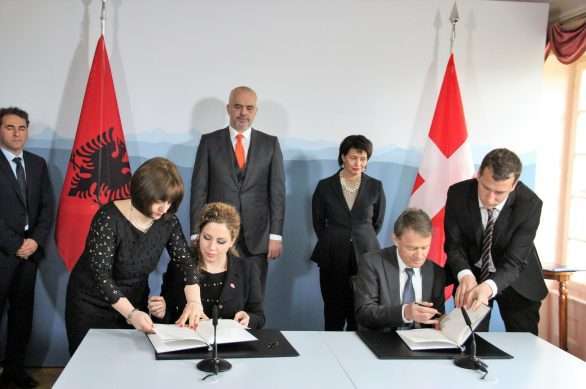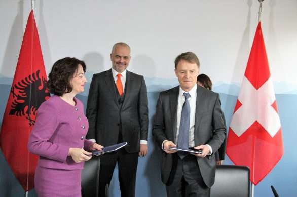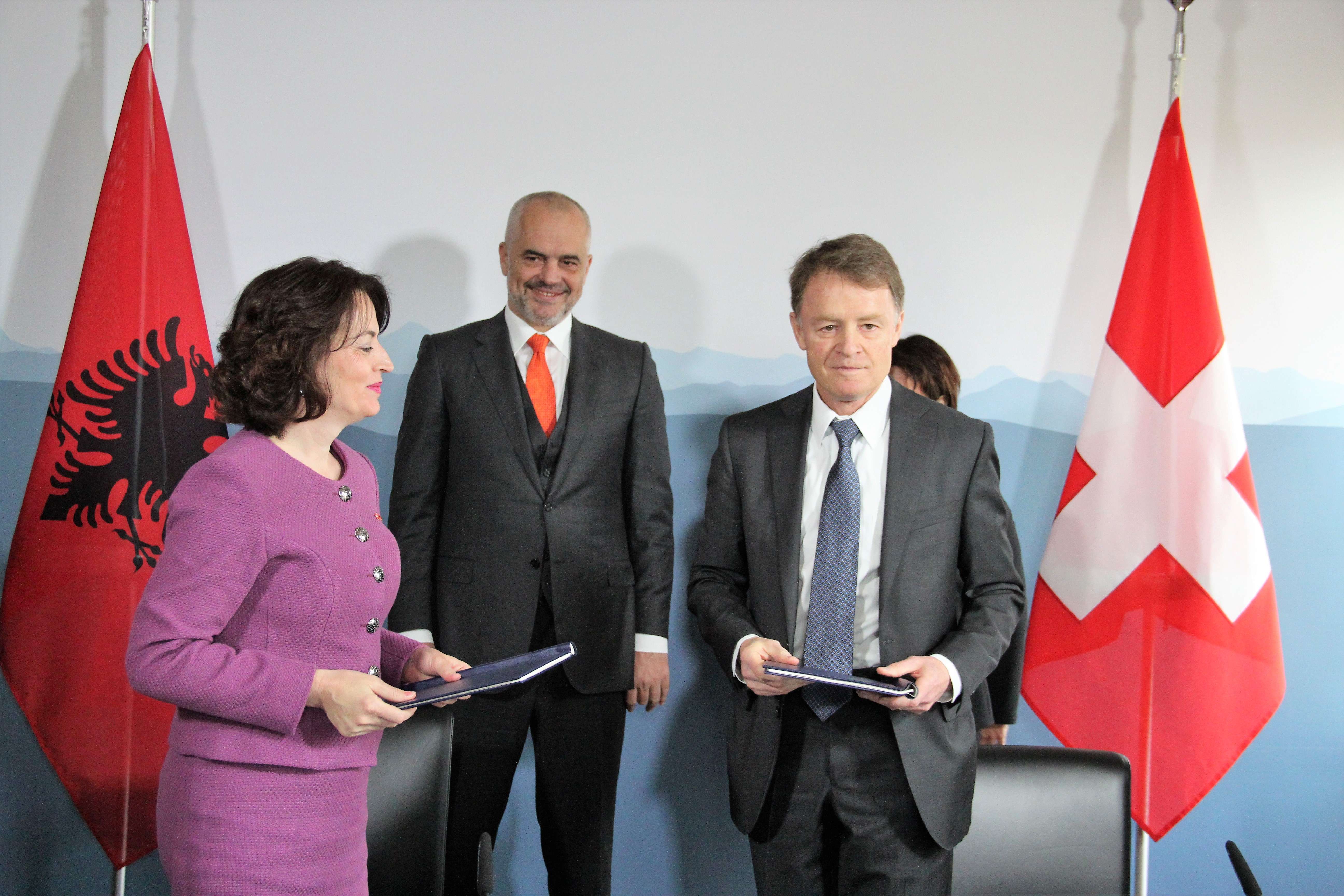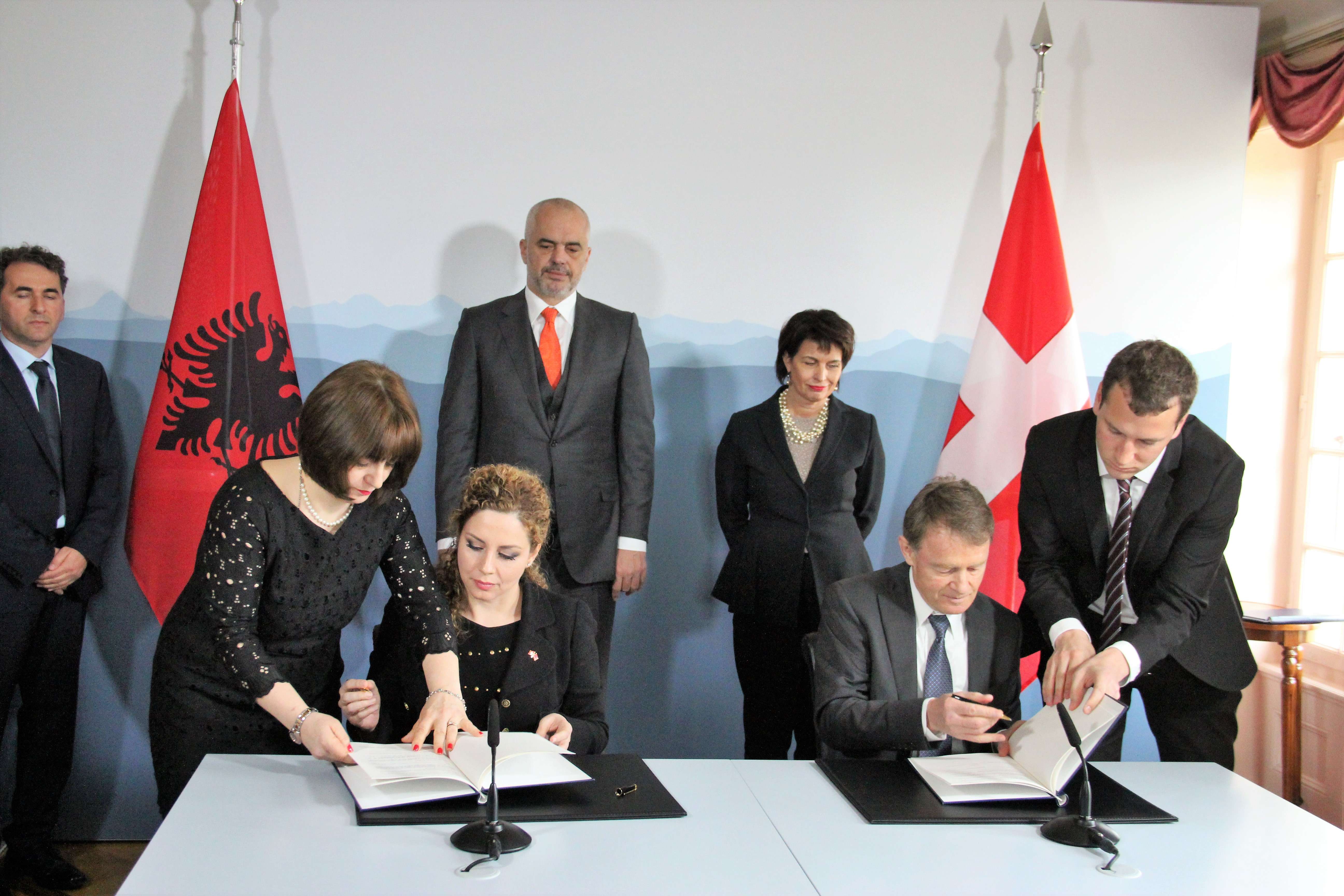 Në kuadrin e vizitës së Kryeministri Rama me delegacionin qeveritar në Zvicër është bërë nënshkrimi i dy marrëveshjeve ndërshtetërore. Ministrja për zhvillim urban e Shqipërisë, Eglantina Gjermeni dhe ambasadori Manuel Sager, drejtor federal i Drejtorisë për Zhvillim dhe Bashkëpunim i Zvicrës kanë nënshkruar projektmarrëveshjen për programin e zhvillimit regjional në Shqipëri. Ndërsa ministrja për mirëqenie sociale dhe rini e Republikës së Shqipërisë, Olta Xhaçka ka nënshkruar Projektmarëveshjen për arsimin profesional në tregun e punës në Shqipëri. Nga ana zvicerane nënshkrues i kësaj marrëveshjeje ishte po ashtu Manuel Sager, drejtor federal i Drejtorisë për Zhvillim dhe Bashkëpunim i Zvicrës.