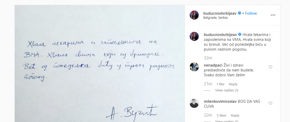 “Faleminderit mjekëve dhe stafit të Spitalit Ushtarak. Faleminderit për të gjithë ata që u kujdesën. Do të jem në punë me orar të plotë duke filluar nga e hëna”, ka thënë Vuçic në Isntagram, transmeton Gazeta Express.