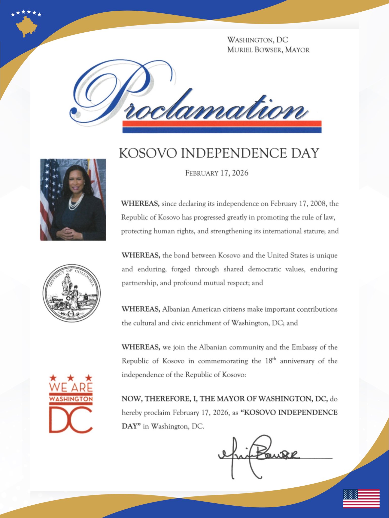 Ambasada e Kosovës në Washington DC ka njoftuar se kryetarja e kryeqendrës së SHBA-së, Muriel Bowser, ka vendosur që 17 shkurti, Dita e Pavarësisë së Kosovës, të shpallet datë zyrtare në Washington DC.