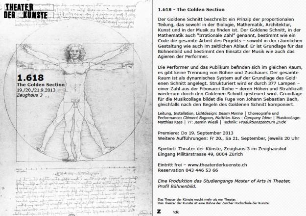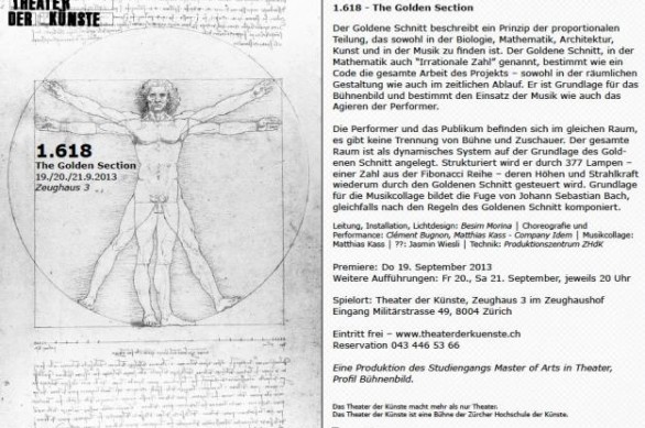 “Prerja e Artë” është zbatuar që nga piramidat e Egjiptit, arkitekturës antike, greke dhe romake, dhe ajo e sotme moderne, si p.sh. Muzeu i Luvrit, etj.”, tregon përmbajtjen e shfaqjes premierë që do ta ofrojë për audiencën zvicerane artisti nga Kosova. Në projektin e tij që quhet “1.618 The Golden Section“ janë edhe dy koreografë dhe balerinë modernë, Matthias Kass dhe Clement Bugnon.