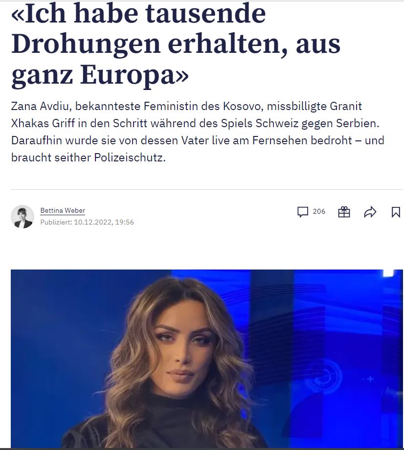 “Zana Avdiu, feministja (sipas gazetës) më e shquar e Kosovës, nuk e miratoi gjestin e Granit Xhakës gjatë ndeshjes Zvicër-Serbi. Si rezultat, babai i Xhakës kërcënoi atë drejtpërdrejt në televizion – dhe që atëherë ajo ka nevojë për mbrojtje nga policia”, shkruan gazeta, transmeton albinfo.ch.