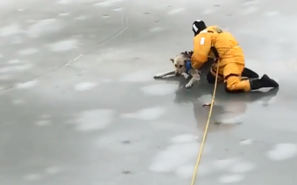 Denis Pilon, një zjarrfikës në Kanada, ka ndarë një video në Facebook në të cilën shihen zjarrfikësit duke shpëtuar një qen i cili ishte ngujuar në akull.