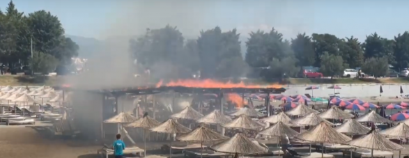 Një ‘beach bar’ dhe çadrat e një resorti po digjen, ndërkohë që flakët rrezikojnë hotelin që ndodhet shumë pranë vatrave të zjarrit.