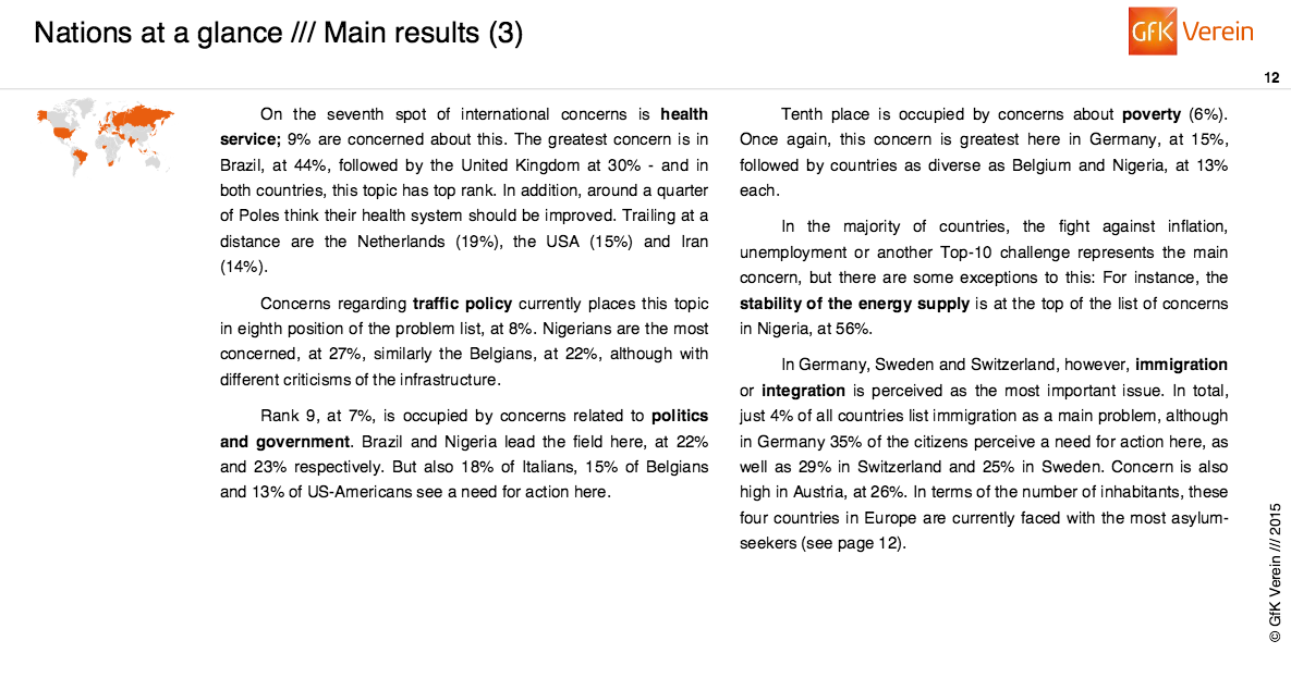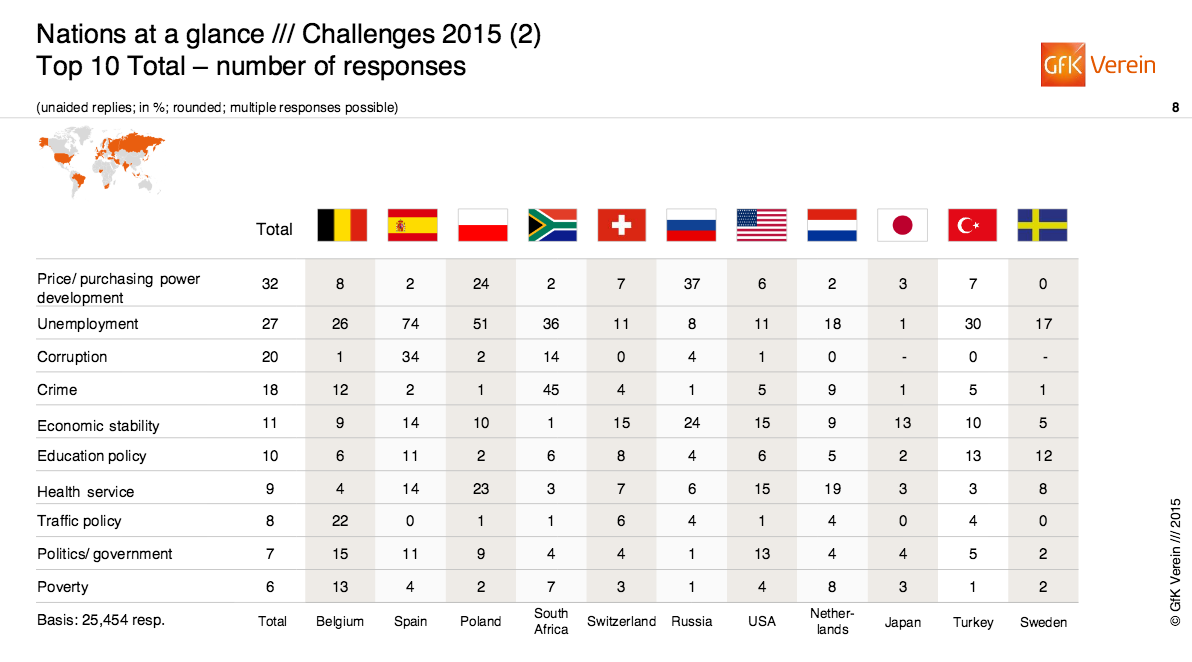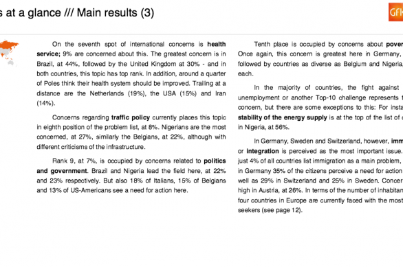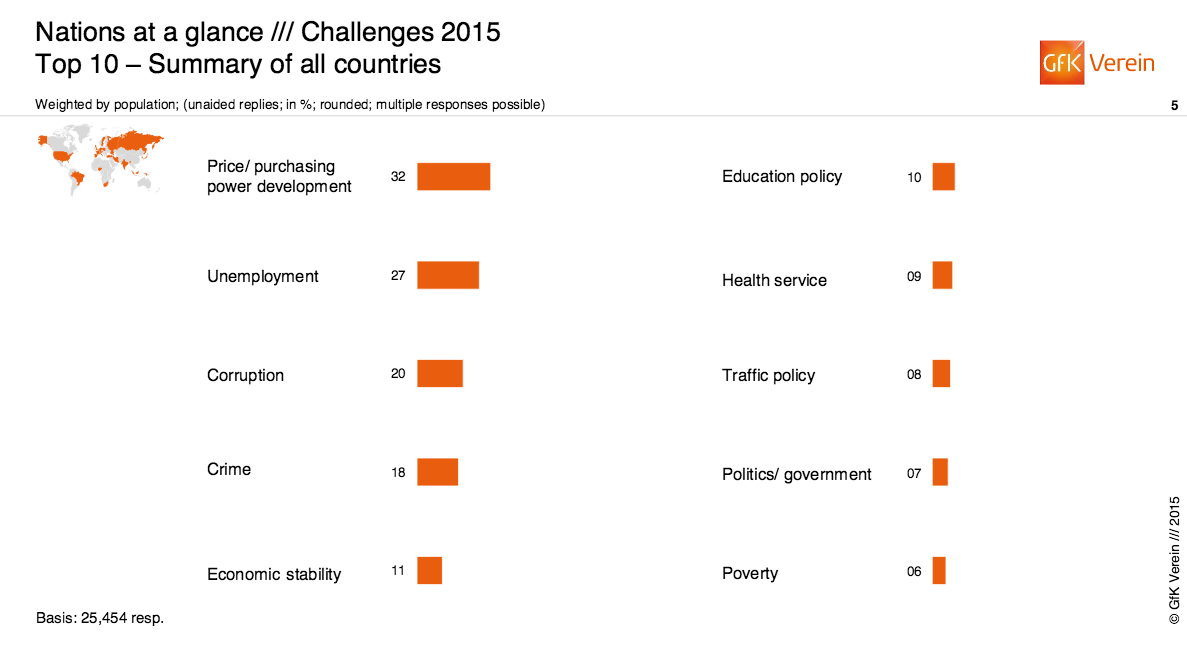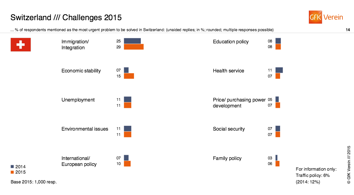Në krye të shkallës së brengave në botë janë çmimet në rritje dhe në rënien e fuqisë blerëse. Ndryshe, në Zvicër mbizotëron sidomos frika nga emigracioni dhe mungesa e integrimit. Tre nga dhjetë të anketuarit në këtë drejtim janë të shqetësuar – në krahasim me vitin e kaluar, një rritje prej katër për qind.