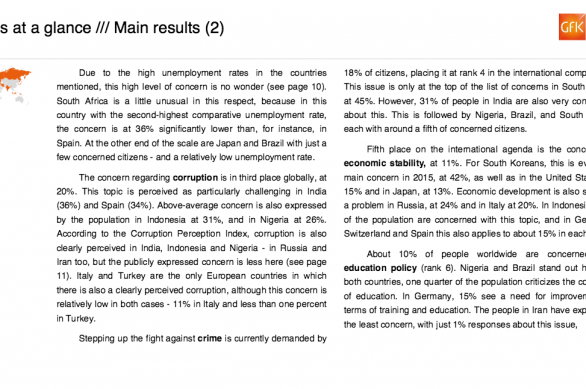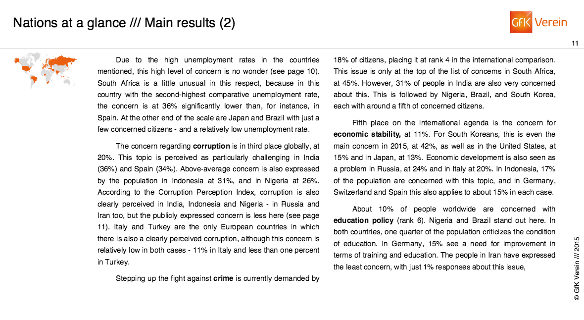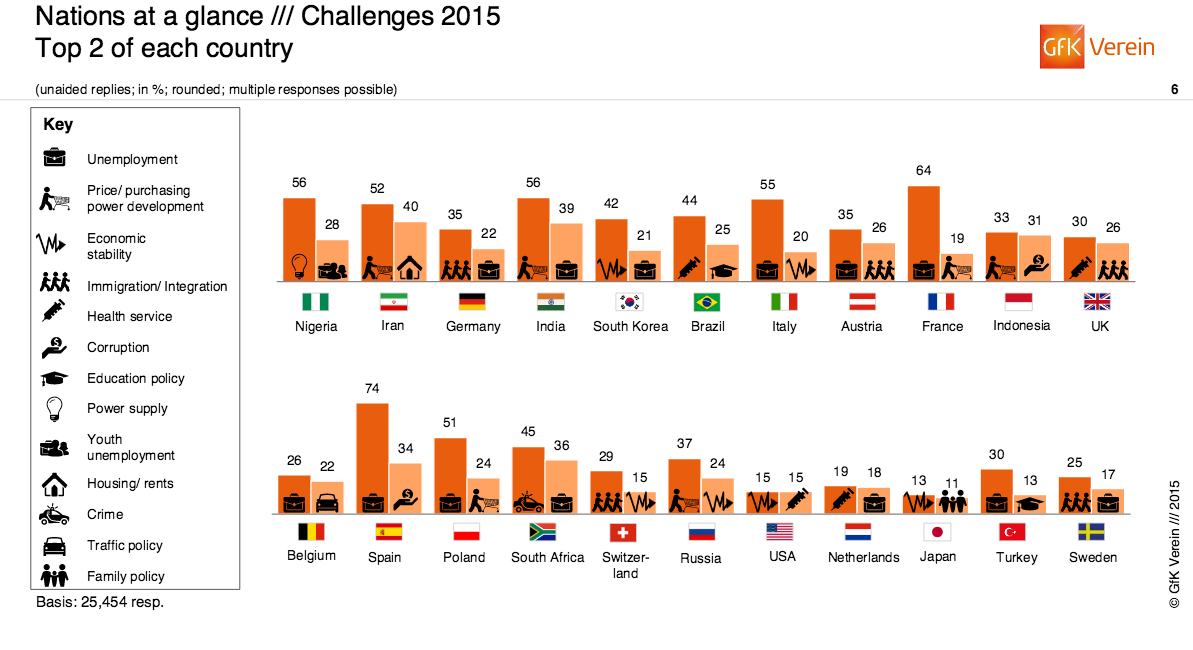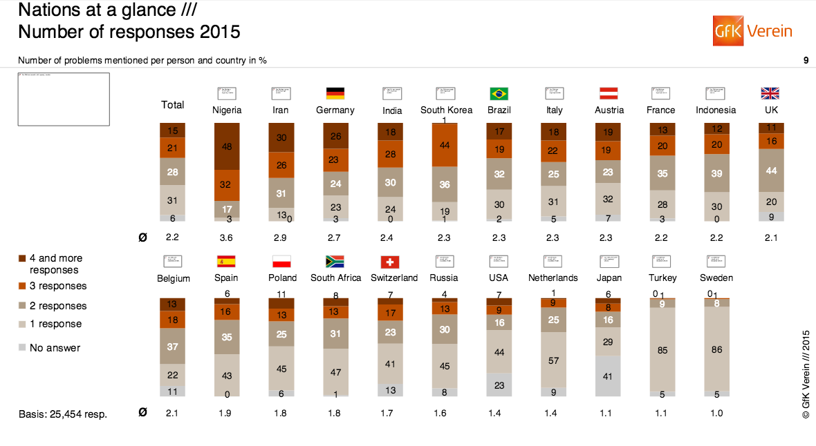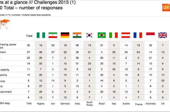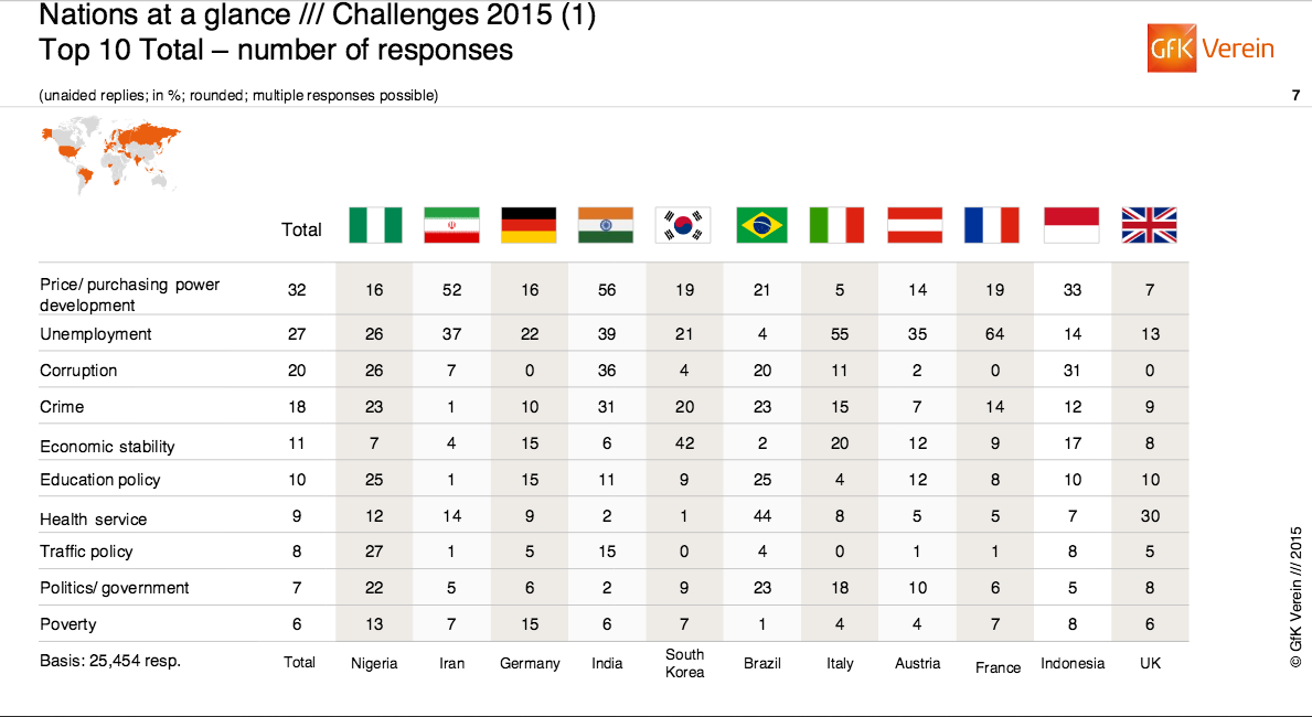 Në krye të shkallës së brengave në botë janë çmimet në rritje dhe në rënien e fuqisë blerëse. Ndryshe, në Zvicër mbizotëron sidomos frika nga emigracioni dhe mungesa e integrimit. Tre nga dhjetë të anketuarit në këtë drejtim janë të shqetësuar – në krahasim me vitin e kaluar, një rritje prej katër për qind.