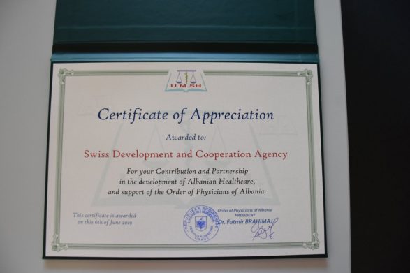 Në këtë përvjetor Urdhri i Mjekëve të Shqipërisë i dha një certifikatë vlerësimi Agjencisë Zvicerane për Zhvillim dhe Bashkëpunim (SDC).